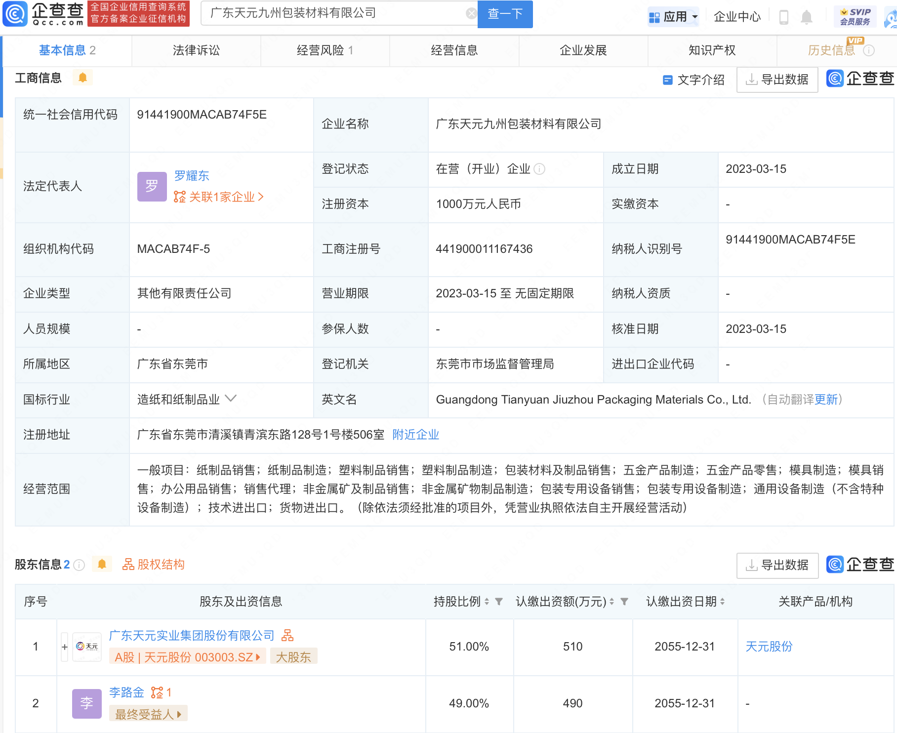 企查查APP显示,近日,广东天元九州包装材料有限公司成立,法定代表人为罗耀东,注册资本1000万元人民币,经营范围包含:五金产品制造;五金产品零售;模具制造;模具销售等。企查查股权穿透显示,该公司由天元股份(003003)、李路金共同持股。