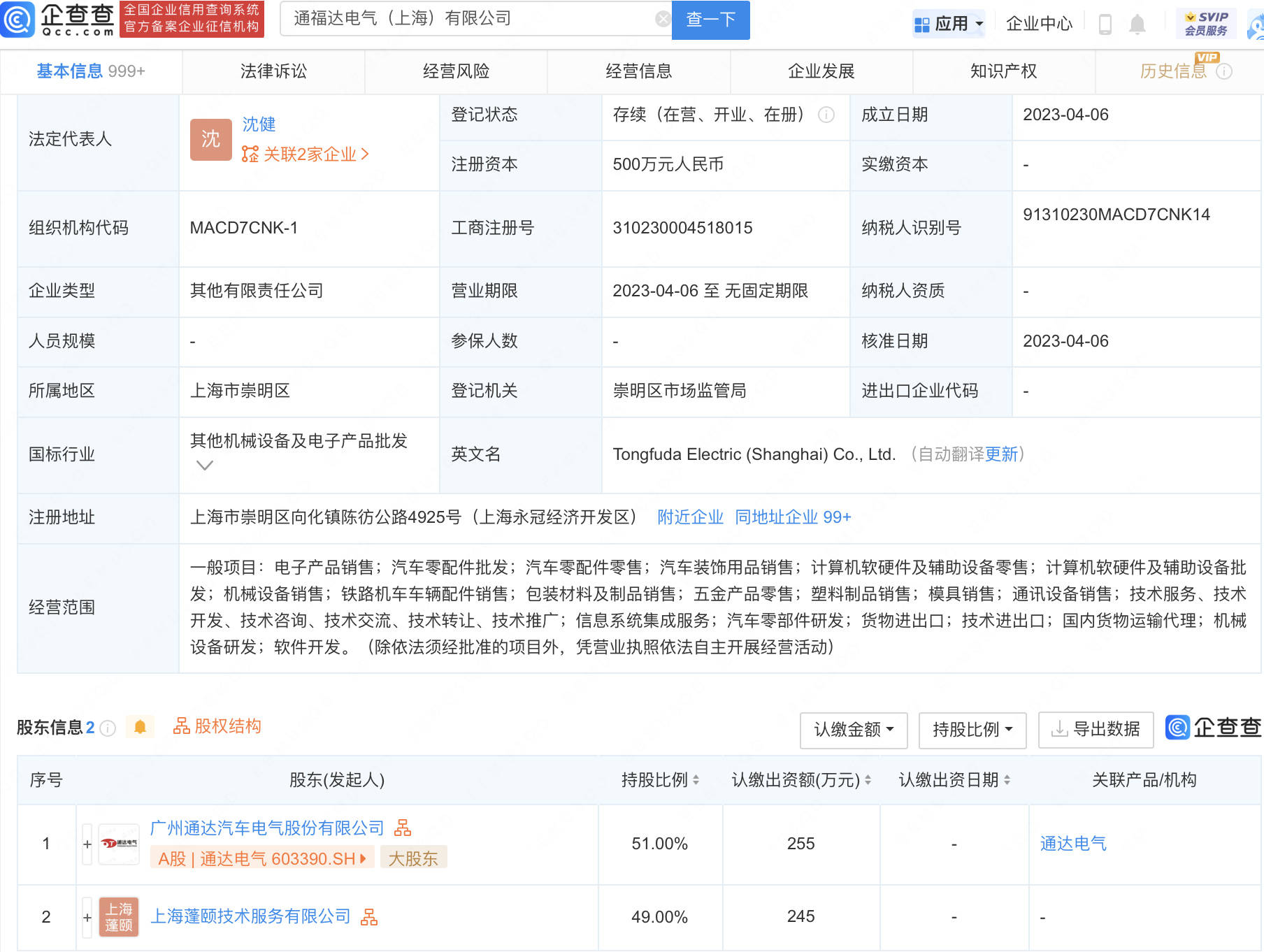 企查查APP显示,近日,通福达电气(上海)有限公司成立,法定代表人为沈健,注册资本500万元人民币,经营范围包含:模具销售;汽车零部件研发;货物进出口;技术进出口等。企查查股权穿透显示,该公司由通达电气(603390)、上海蓬颐技术服务有限公司共同持股。