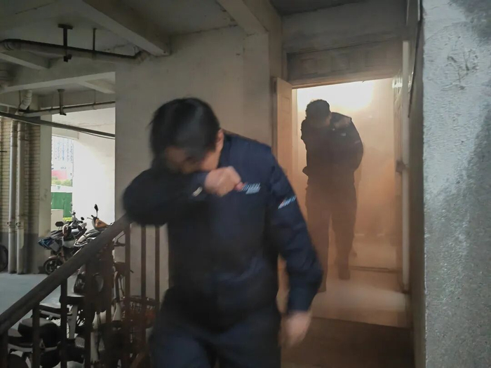 演练模拟宿舍楼突发火情,现场烟雾弥漫。警报响起后,员工在安全员引导下,用衣物捂住口鼻,沿预定路线低姿、快速撤离至安全区域。整个过程指令清晰、行动规范,均在短时间内完成全员疏散,体现了应急预案的有效性。