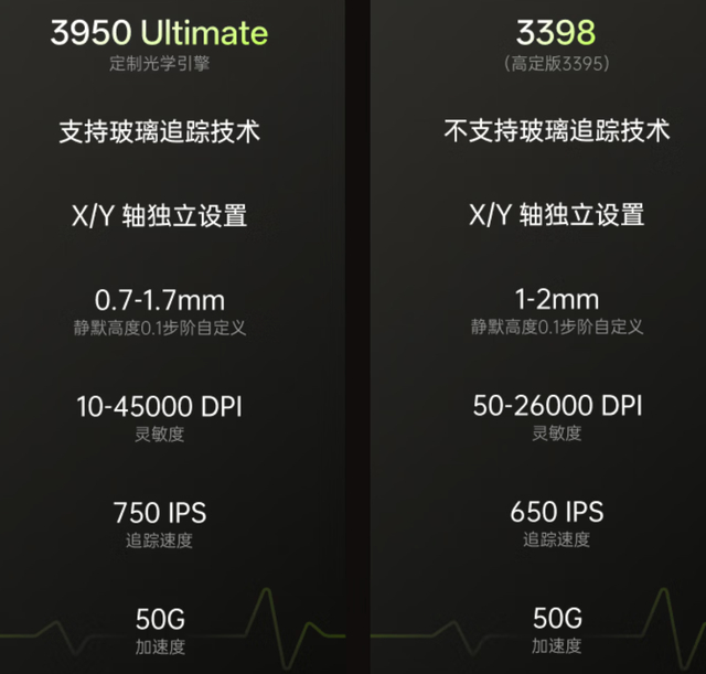 标准版的原相3398定制传感器,以及MAX版的原相3950Ultimate,分别提供了50-26000、10-45000的DPI调节范围,可调静默高度,以及受到玩家认可的加速度、追踪速度、稳定性等体验。